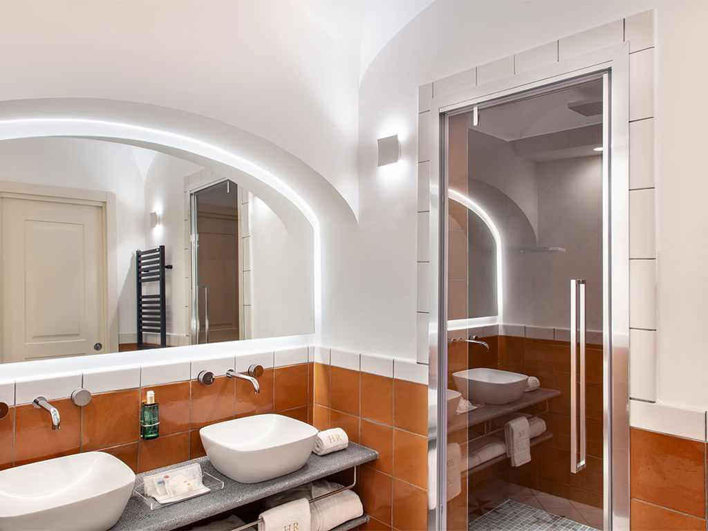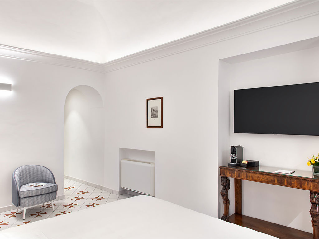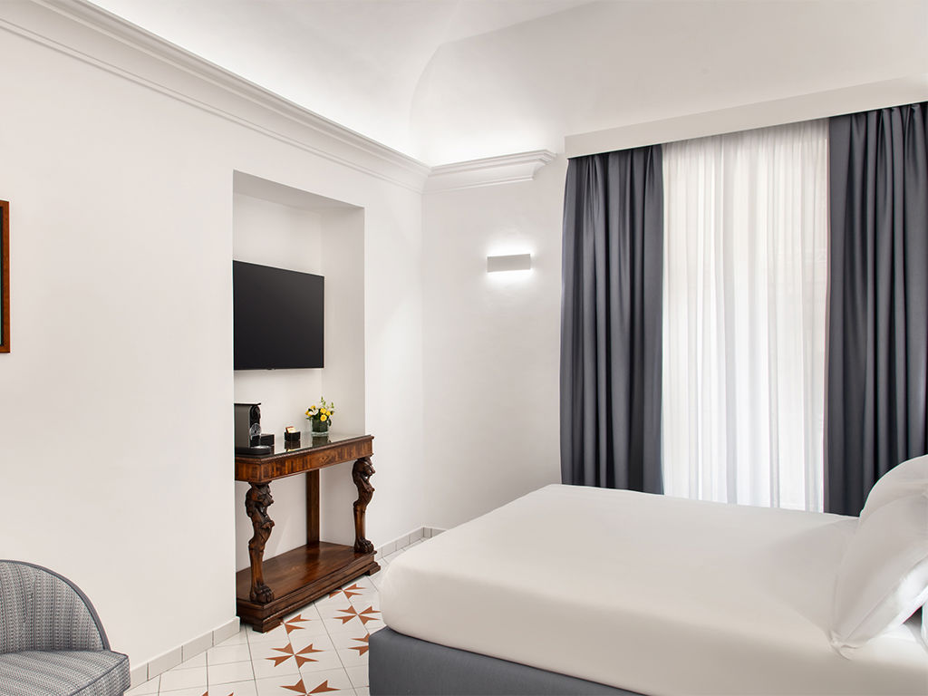 Spacious and luminous, the Premium Deluxe City View Room covers approximately 30 sqm. Refined in every detail, it boasts a balcony overlooking the charming streets of Amalfi, where guests can admire the vibrant Piazza Duomo or historic buildings—immersed in the unique charm of the town and the timeless spirit of the Amalfi Dolce Vita.